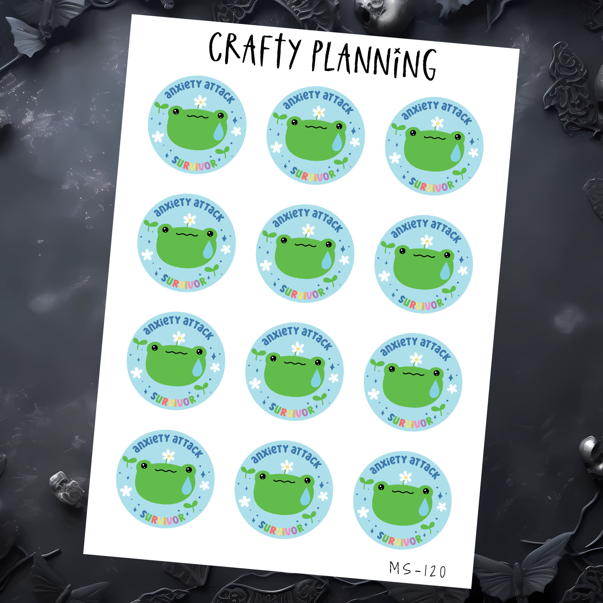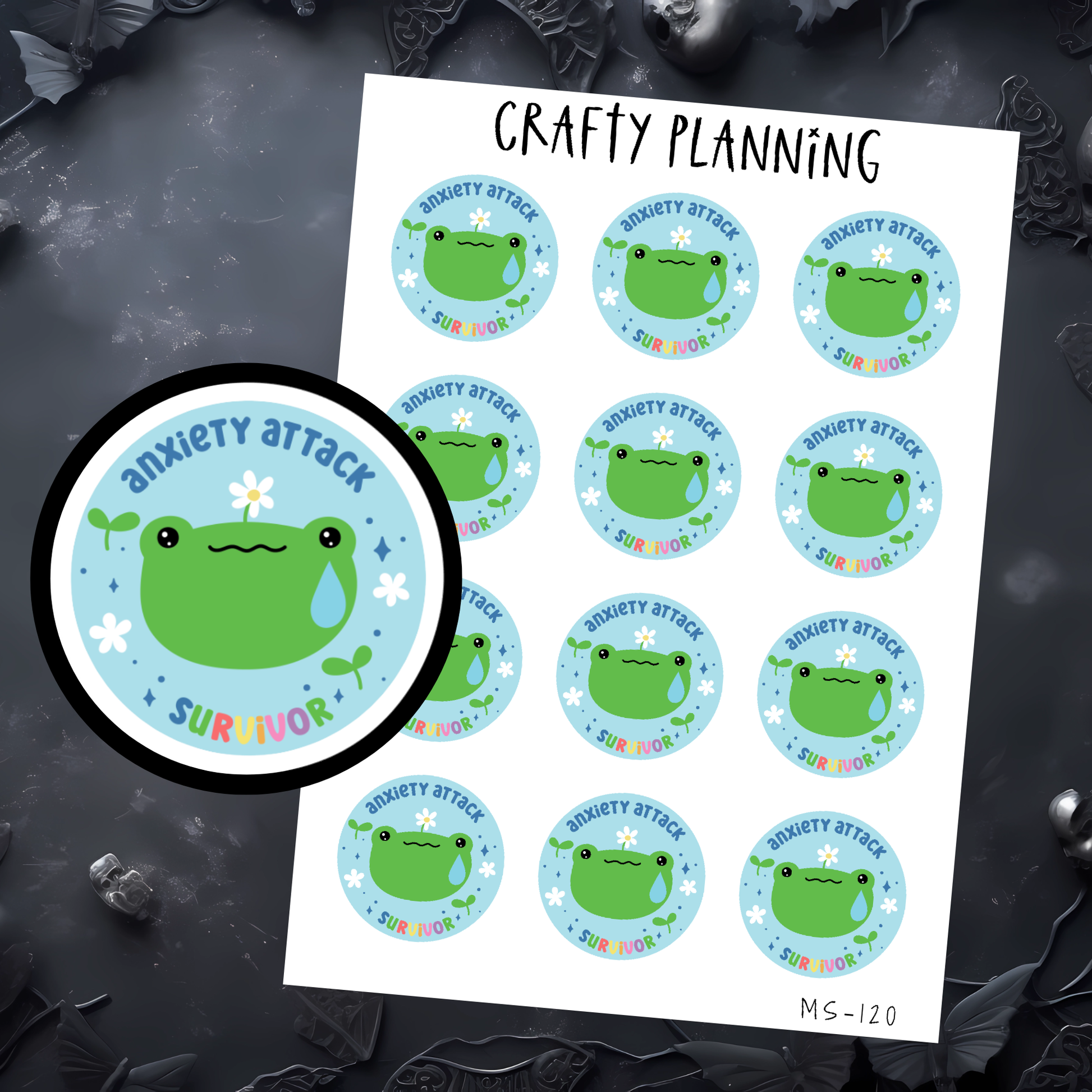 Mini sheet of 'anxiety attack survivor' stickers featuring a cute frog design.