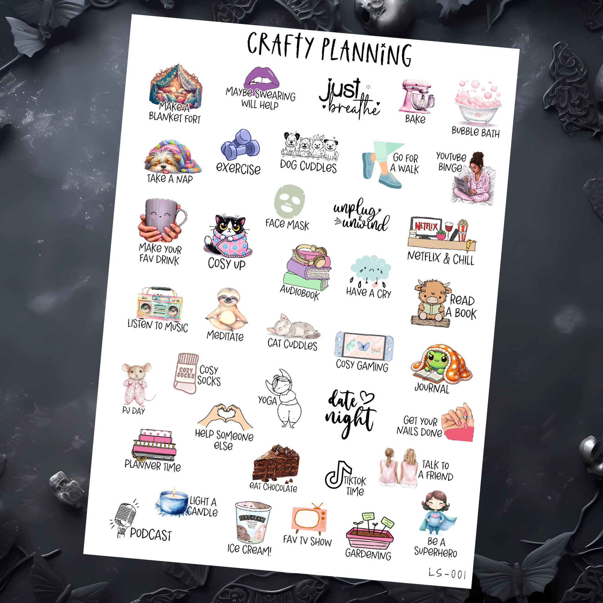 As an anxiety sufferer myself, I found these stickers a great help when I know my anxiety is bad but I can't focus to think of what might help. Also a great gift for a friend or relative who may also be struggling with stress or anxiety. Can be used in journals and planners or even just as little reminder stickers on happy mail.