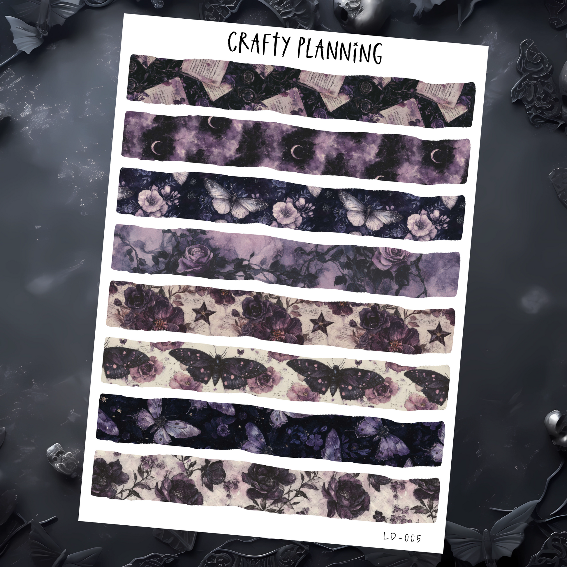 These torn washi strips are part of the Dark Romance collection. They are perfect for layering stickers, decorating pages and letters and to fill up unwanted white space.