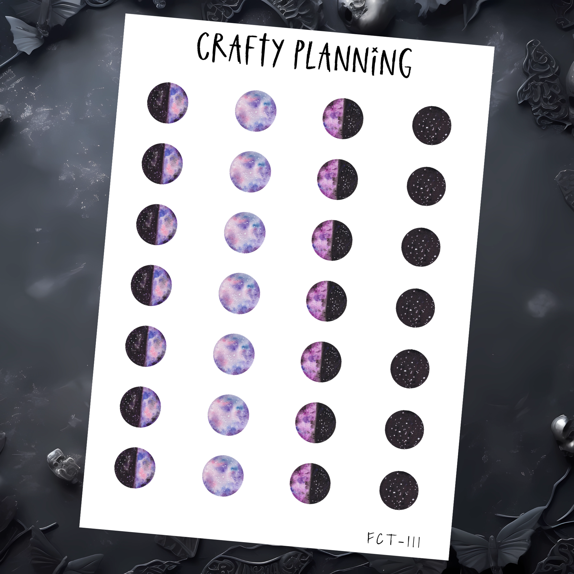 Mini size undated purple moon phase stickers. Also available as teeni stickers or as a large sheet with dates for easy placement.