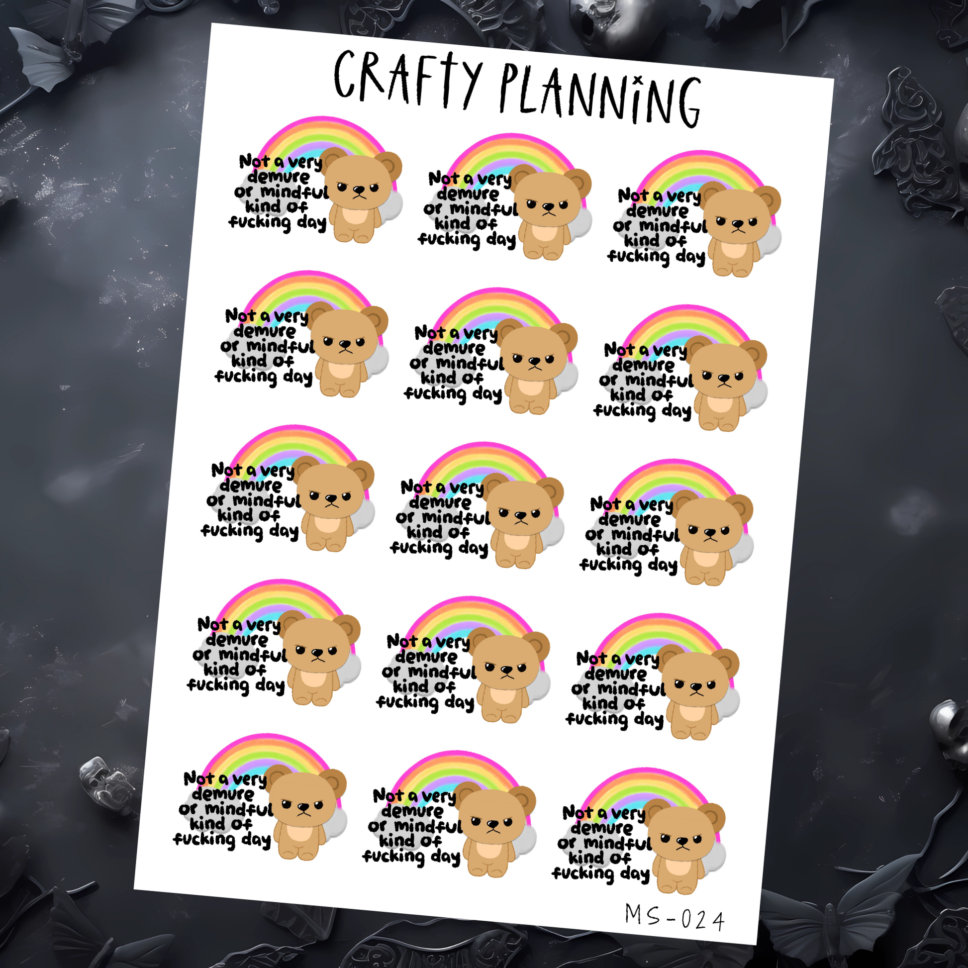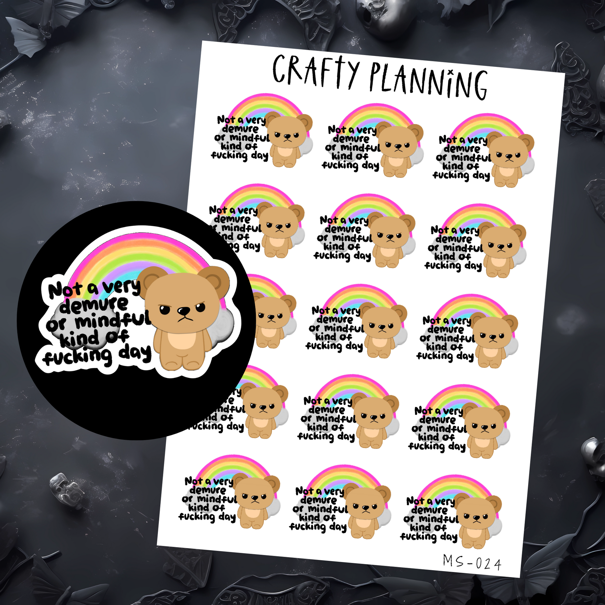 Not A Very Demure or Mindful Kind of Fucking Day sticker sheet, also available as a single large vinyl sticker.